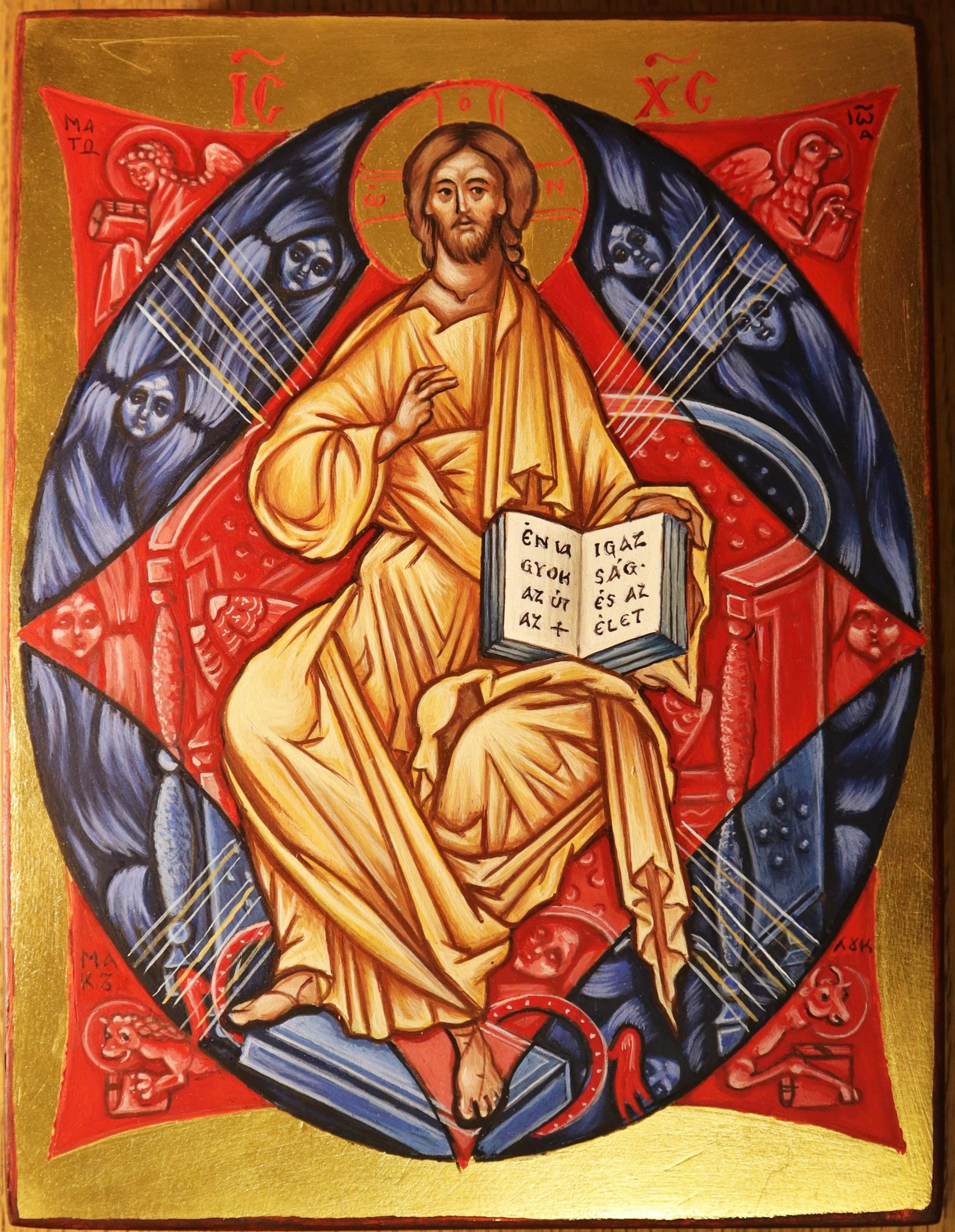 evangélisták szimbólumai (angyal, oroszlán, bika, sas) veszik körül. Ez a